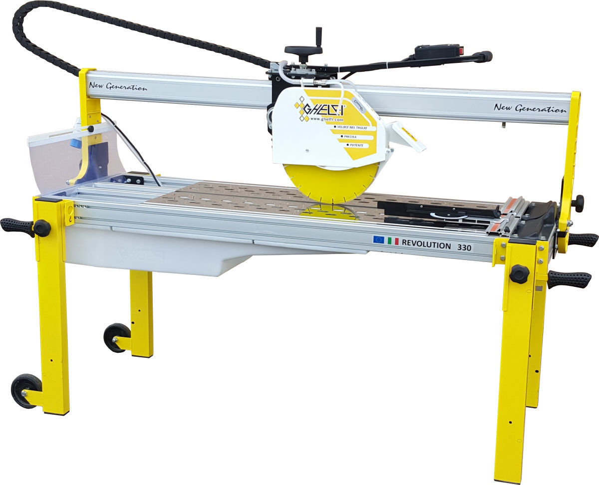 er en nøyaktig, stabil og meget kraftig sag for dem som kutter både store keramiske fliser og stor naturstein. Et prisgunstig alternativ til Ghelfi Revolution 130. Sagen har jollefunksjon og høydejusterbart blad. Bena kan slås opp i transportposisjon og kan på tross av sin størrelse håndteres av 1 person grunnet hjul montert på bena. Meget kraftig motor. Skjærer store lengder og tykkelser.