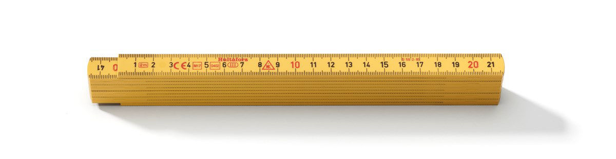Hultafors meterstokk, 2 meter, produsert av glassfiberforsterket polyamid, som gir økt motstand mot fukt.