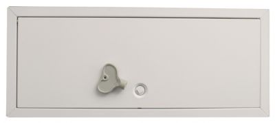 Hvitlakkert luke med nøkkel for adgangskontroll av vitale installasjoner.