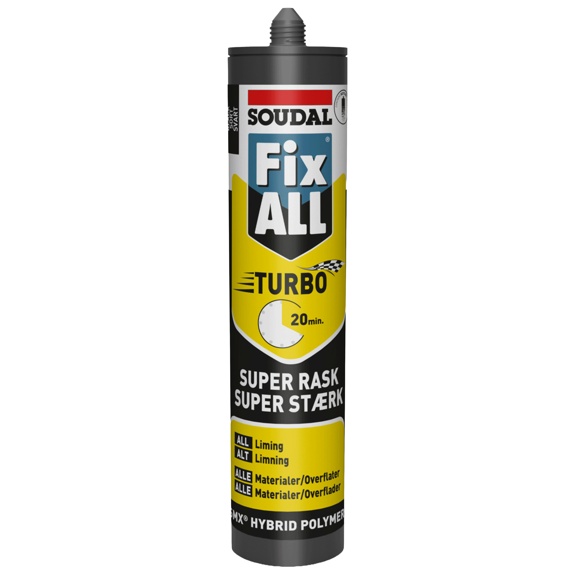 Fix ALL Turbo er et 1-komponent lim basert på hybridpolymer (SMX-teknologi). Produktet har rask styrkeoppbygging og blir hurtig håndterbart etter påføring.