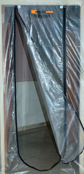 Støvdør som forhindrer støv og smuss i å trekke inn i andre rom ved rehabilitering.