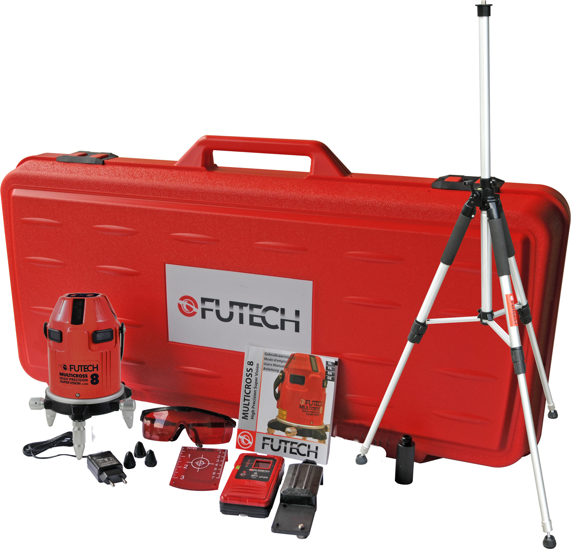 8-streks motorisert selvnivellerende laser med mottaker, stativ 75-300cm og koffert.