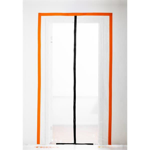 Støvdør av HDPE-plast for tildekking av døråpninger ved f.eks. renovering. En rett åpning helt ned til gulvet som åpnes enkelt og deretter lukkes automatisk takket være magneter. Festes med tape.Dørstørrelse: 2,20 x 1,20 m. Åpningsmål: 2 m.