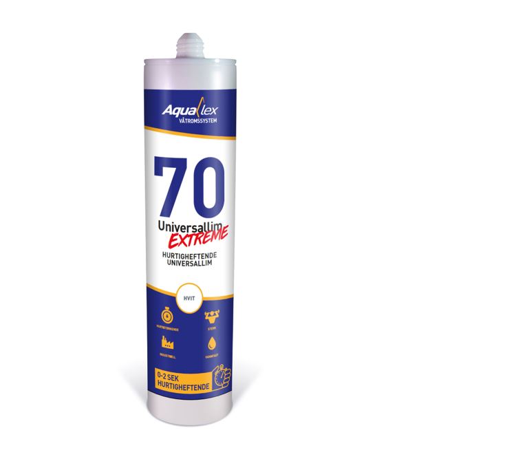 Universallim EXTREME 70 er et universallim for alle slags materialer med unntak av PE og PP.Universallim EXTREME 70 har svært høy initiell heft og kan brukes på de fleste vanlige overflater.Universallim EXTREME 70 er utviklet spesielt for liming av stein, betong, speil, glass, gips, PU, PVC,harde kunststoffer, emalje, keramikk, kobber, bly, sink, tinn, aluminium, metaller, legeringer ogrustfritt stål.Instruksjoner for bruk:Påfør limet med V-tuten i vertikale strenger. Avstanden mellomstrengene bør være 10–20 cm. Trykk deretter materialene mot hverandre til det er minst 2–3 mmmellom de to overflatene.Ikke bruk Universallim EXTREME 70 med pads! Den høye initielle heftenbetyr at det vanligvis ikke er nødvendig med støtte under herdeprosessen.
